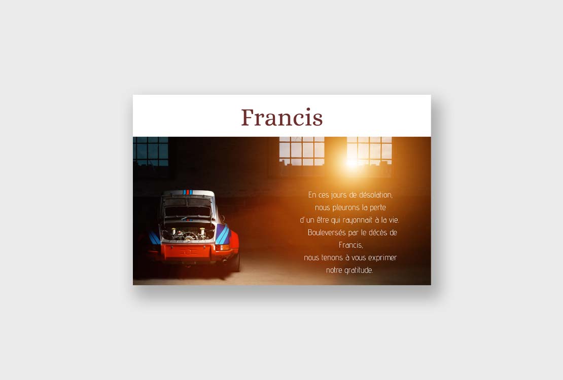 Cette carte de remerciement décès est sur le thème de l’automobile. Photo par défaut pouvant être utilisée ou remplacée par votre propre photo.