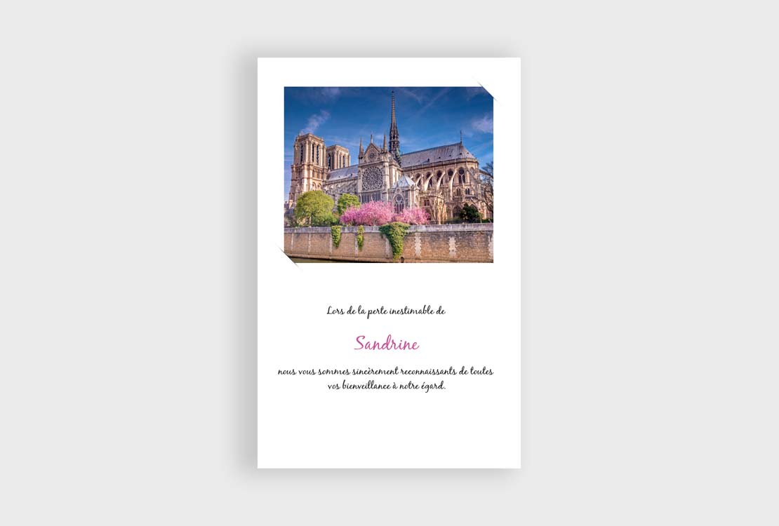 Cette jolie carte de remerciements de décès nous remémore la majestueuse cathédrale Notre Dame de Paris.